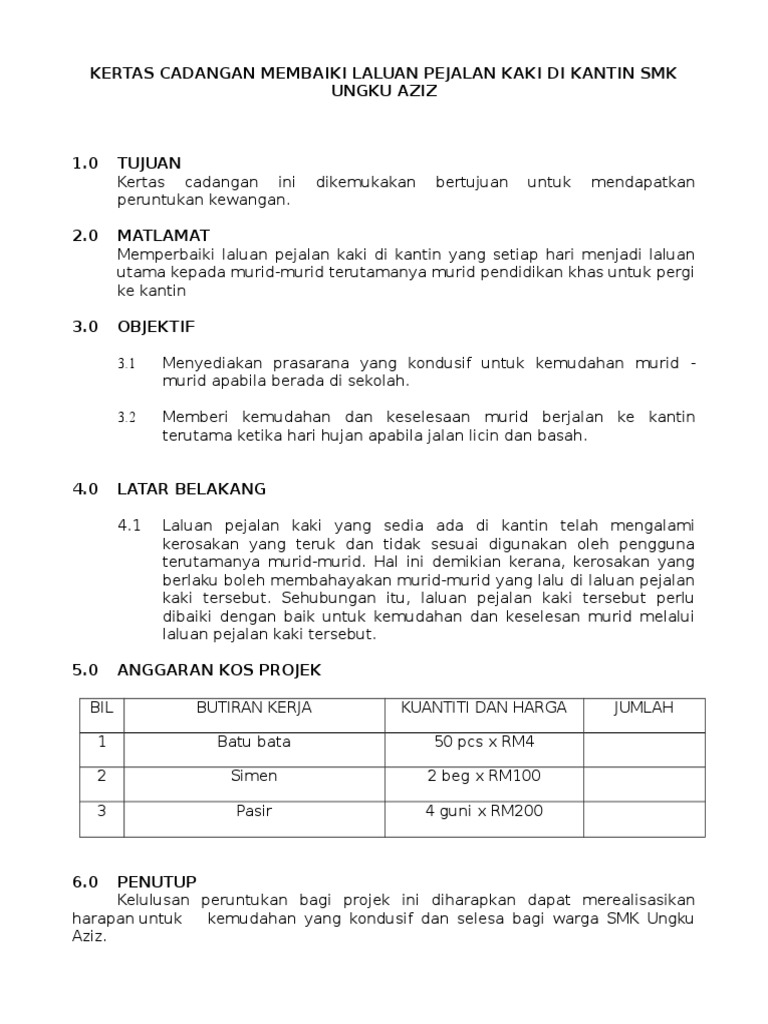 Ppd pihak pentadbir dan semua guru ppki. Contoh kertas kerja untuk pinjaman penternakan lembu. KERTAS KERJA PENAMBAHBAIKAN INFRASTRUKTURTANDAS SEKOLAH SERTA KESELAMATAN MURID 10 PENGENALAN Sekolah Kebangsaan Rompin meupakan salah satu sekolah yang terbesar yang ada didalam kawasan DUN Jeram Padang.